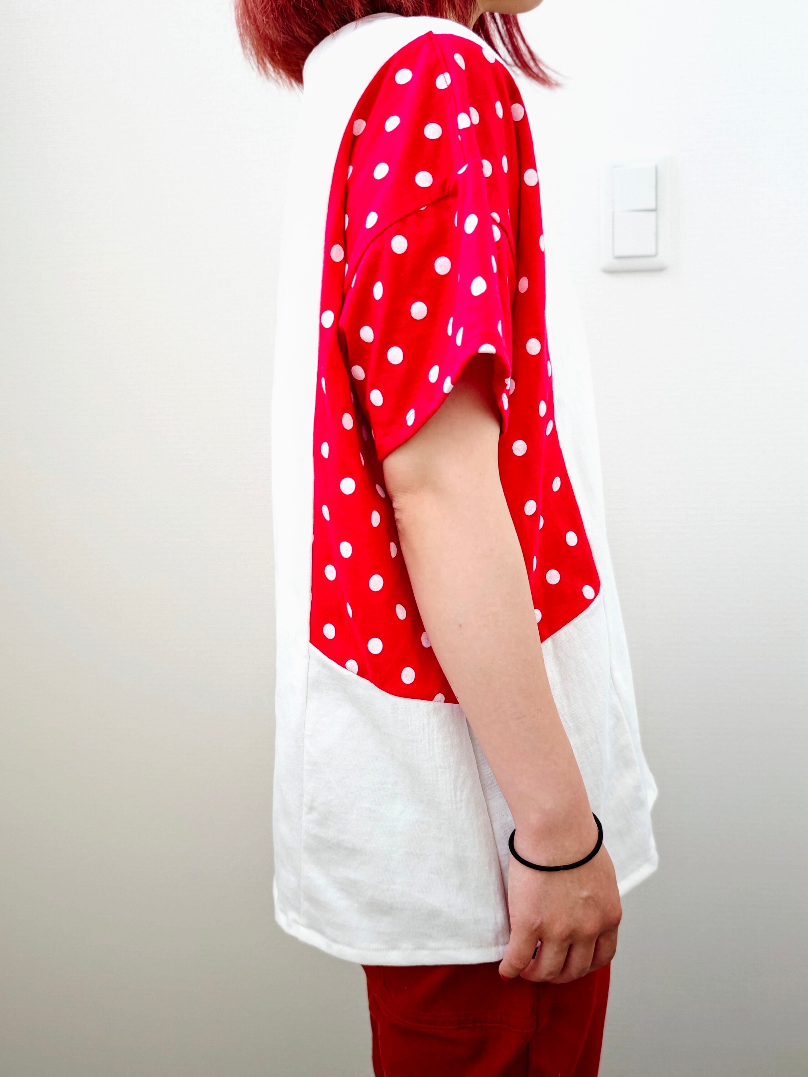 レッド、ブルー、ブラックのドット柄の天竺ニット生地を合わせています。